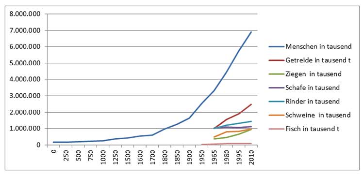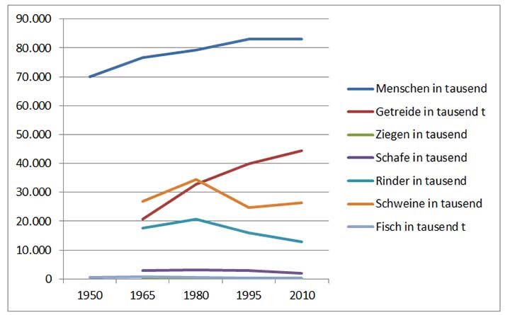 Jahr | Menschen | Getreide | Ziegen | Schafe | Rinder | Schweine | Fisch |