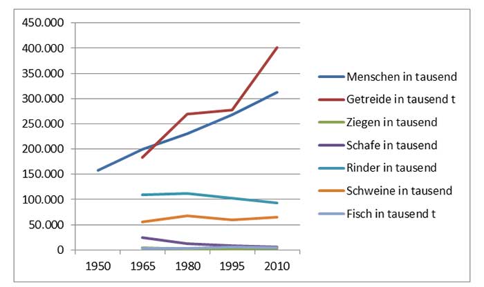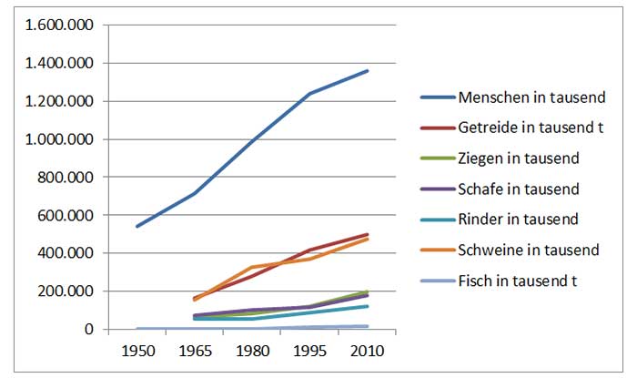Quellen der Statistiken: Getreide bis Schweine 1965 bis 2015; www. factfisch.com; Quelle FAOSTAT (Welternährungs-Organisation) Menschen 1950 bis 2015; www. factfisch.com; Quelle: UN Data Gefangener Fisch: FishstatJ: FAO, Datenbank (Welternährungs-Organisation, ohne Aquakulturen)