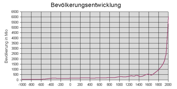 Das Diagramm erweckt den Eindruck, als würde sich die Kurve gegen Ende etwas abflachen, das Bevölkerungswachstum also abnehmen. Doch die Zeiteinteilung der X-Achse ist nicht linear. Am Anfang liegen 1000 Jahre bis zum nächsten Wert, am Ende nur 5 Jahre. Das ergibt ein verzerrtes Bild der Exponentialität.