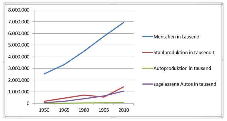Das exponentielle Wachstum betrifft aber nicht nur den Menschen und seine Nutzpflanzen- und Tiere, die große Anteile der Erdoberfläche dominieren, sondern auch Industrieprodukte und Energie, die aus endlichen, oder nur sehr langsam und allmählich nachwachsenden Rohstoffen erzeugt werden. Kohle und Erdöl werden zwar kontinuierlich wieder neu gebildet, wir haben aber in wenigen Jahrzehnten verbraucht, was sich in Milliarden Jahren gebildet hat. Eine wichtige Rolle bei diesen Verbräuchen spielen hierbei auch die Lieblingstiere vieler Menschen, die Tiere mit den runden Beinen – unsre Autos. Deshalb hier eine Grafik, bei der dieser „Mitbewohner“ eine wichtige Rolle spielen. Am Anfang des Buches zeige ich ein paar Grafiken vom Beginn meiner Recherche. In den nachfolgenden Kapiteln wird meine Datenbasis bis ins Jahr 2020 reichen.