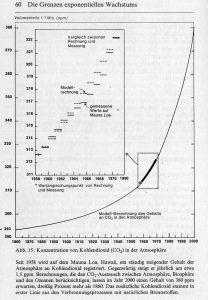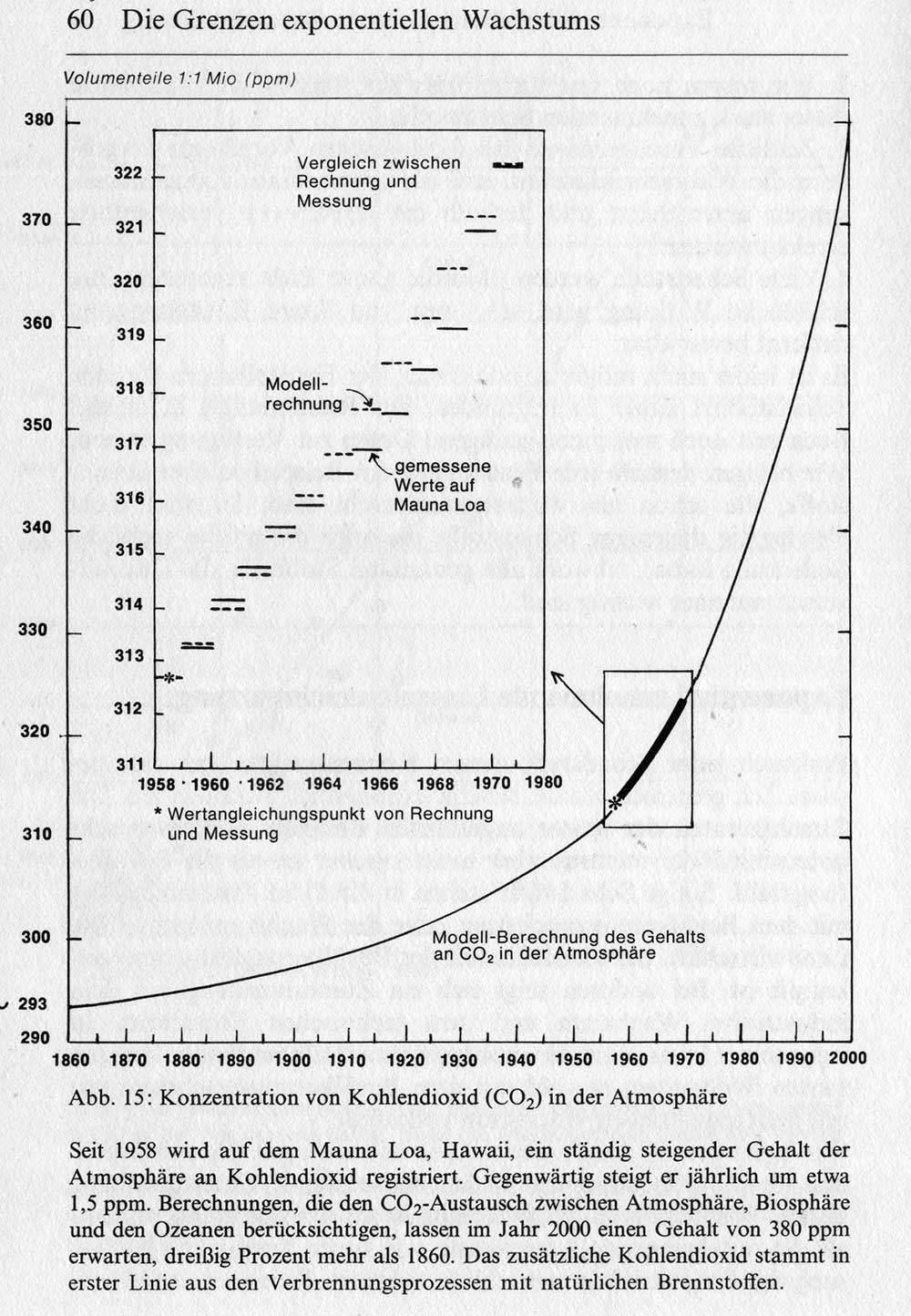 Verblüffend ist auch ein Diagramm mit der Interpolation des Anstiegs des Kohlendioxidgehalts der Luft, die bereits in Grenzen des Wachstums 1972 veröffentlicht wurde. Sie wurde in einer Zeit erstellt, als nur eine Handvoll Wissenschaftler sich mit dem Global Warming Effect beschäftigten. Der Klimawandel war nicht in der ersten Publikation berücksichtigt, man kannte ihn schlicht noch nicht. Die Berechnung des Anstiegs entspricht aber fast exakt der inzwischen eingetretenen Realität.