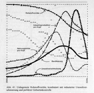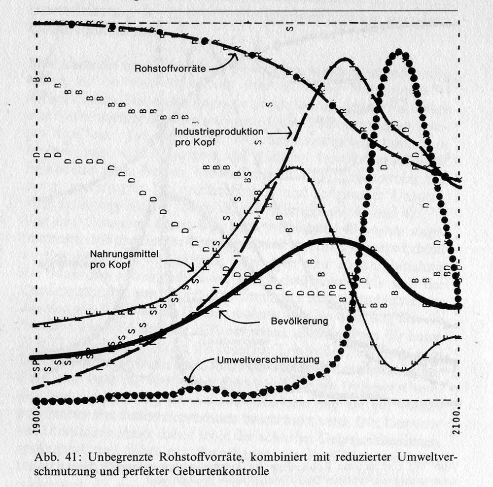 Die Wissenschaftler fütterten die Computer mit Unmengen Daten über Bevölkerungszahl, landwirtschaftliche Flächen- und Produktion, usw. und ließen sie verschiedene Durchläufe mit verschiedenen Szenarien rechnen. So gibt es Szenarien mit unbegrenzten Rohstoffvorräten genauso, wie Läufe mit den bekannten Vorräten, den wahrscheinlich in den nächsten Jahren zu entdeckenden, oder den nach den Erkenntnissen der Geologie in der Zukunft wahrscheinlich nutzbaren Vorräten. Auch beim Bevölkerungswachstum ging man von verschiedenen Möglichkeiten und Raten aus. Die Grafik unten zeigt ein Diagramm, in der Kurven wesentlicher Werte der Ergebnisse eines Durchlaufs mit optimistischen Werten und Bedingungen berechnet wurden.